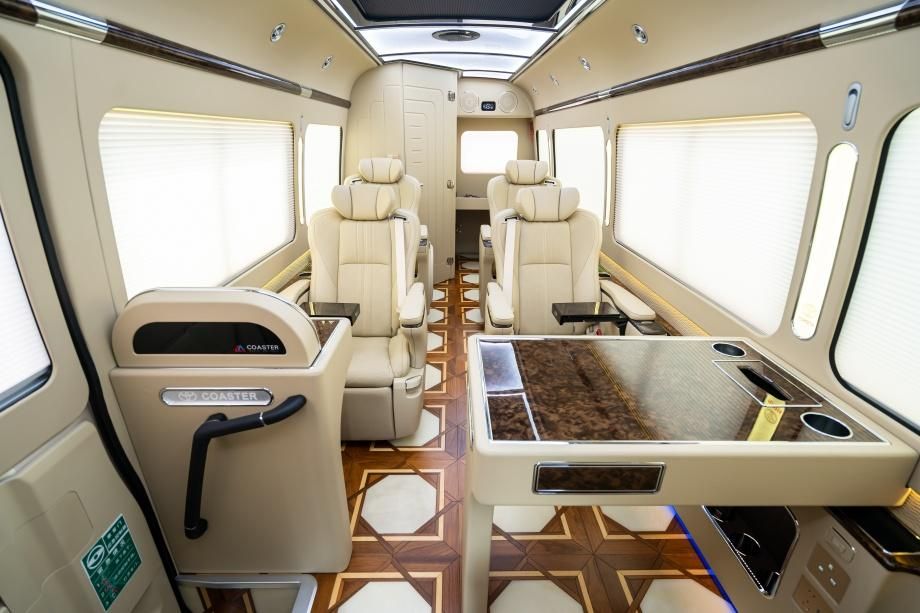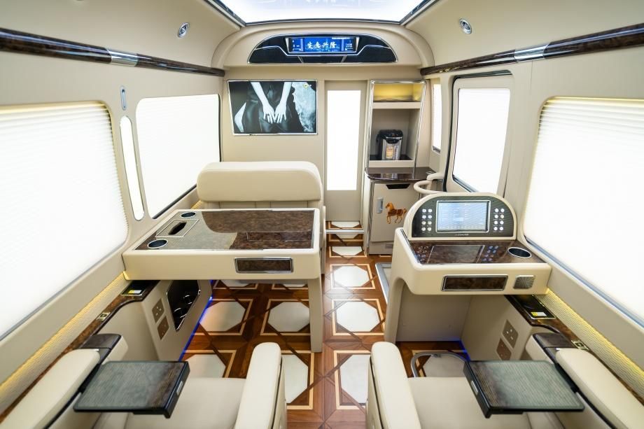 4 张原装埃尔法座椅构筑中心舒适区,金丝环绕大理石地板铺陈奢雅质感,雾化中门前间隔 + 长条形广告屏打造私密展现空间,扇形喇叭罩、穹顶风道等细节尽显定制用心,侧滑工作桌、空客顶灯、车载卫生间适配多元需求,瘿木桃木装修点睛大局,为 8 人高端团队打造 “移动奢华会所” 级出行体会。丰田考斯特有着许多不一样的版别,座位数量可按需定制,还能够改装成奢华公事座舱运用。丰田考斯特搭载4.0天然吸气V6发动机,车长7米005,宽2米04,高2米76,百公里归纳油耗14.6升!