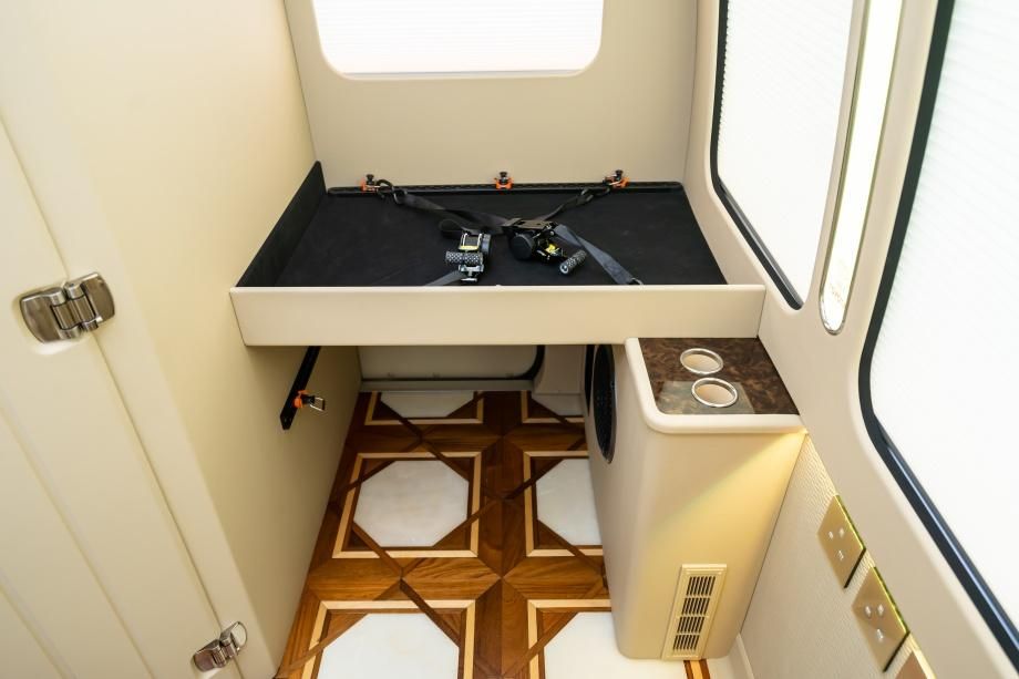 :车身尾部设置干湿别离卫生间,装备可降解马桶与折叠洗手池,顶部通电扇每小时换气 30 次,合作活性炭过滤体系,舱内无异味;洗手池感应出水,镜面带防雾功用,细节交心。